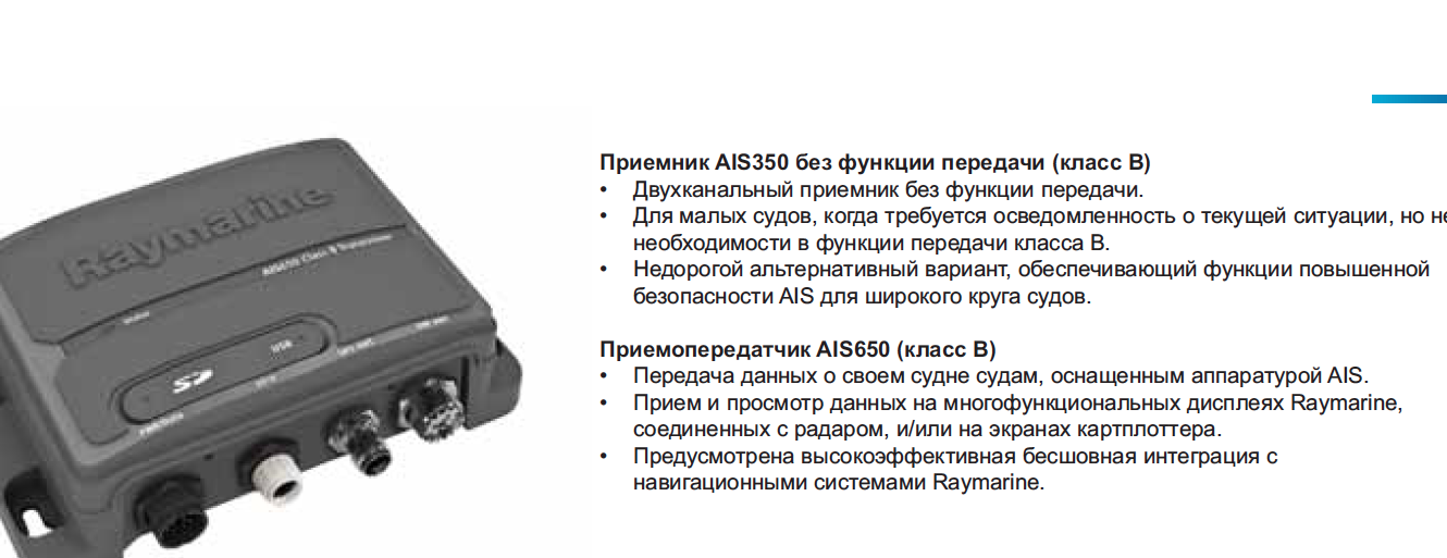 Приймач Класу В дає змогу вам передавати дані іншим судам, обладнаним АІС, й отримувати інформацію від них. Дані можуть бути показані на екрані вашого дисплея Raymarine у вікні радара або картплотера. Компактний АІС650 під'єднується в навігаційну мережу Raymarine. АІС класу В передає пакет навігаційних даних, підходить для невеликих комерційних і прогулянкових кораблів, які не піддаються вимогам IMO/SOLAS.